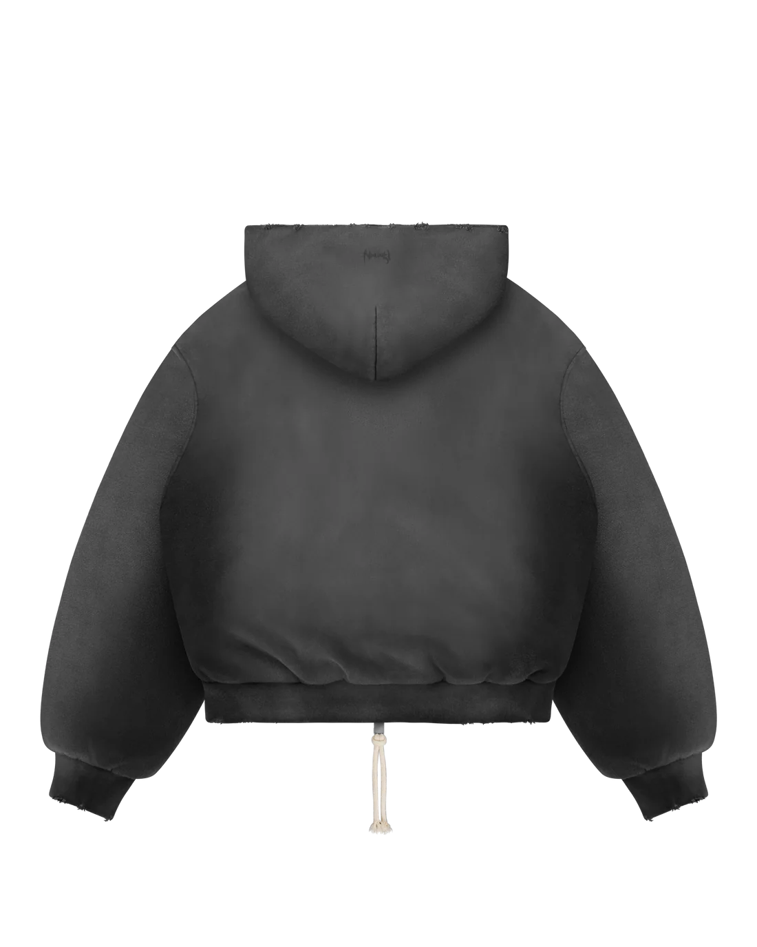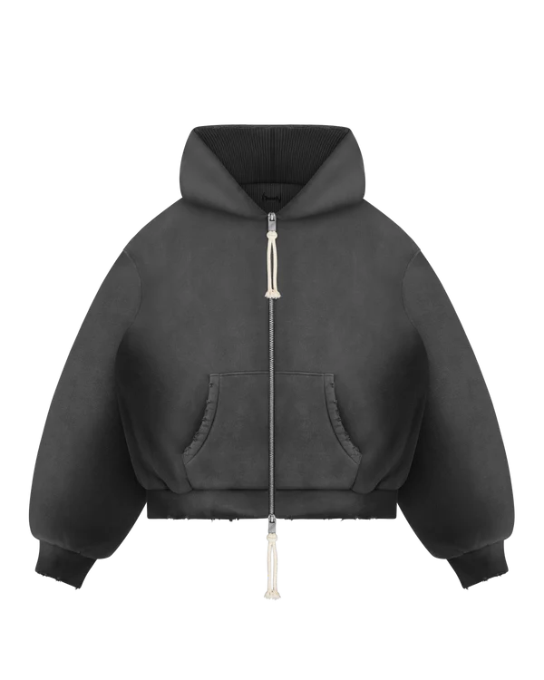 Design: vestibilità oversize, taglio corto, spalle scese, maniche voluminose, colletto/polsini a coste spesse, tasca frontale a marsupio e chiusura completa con cerniera in corda/cordino.
