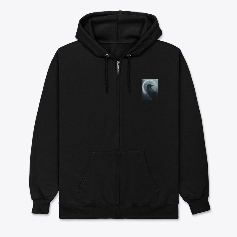 Design: felpa con cappuccio con zip intera, tasche frontali, maniche lunghe e una piccola stampa sul petto raffigurante un Reaven con un etereo alone lunare.