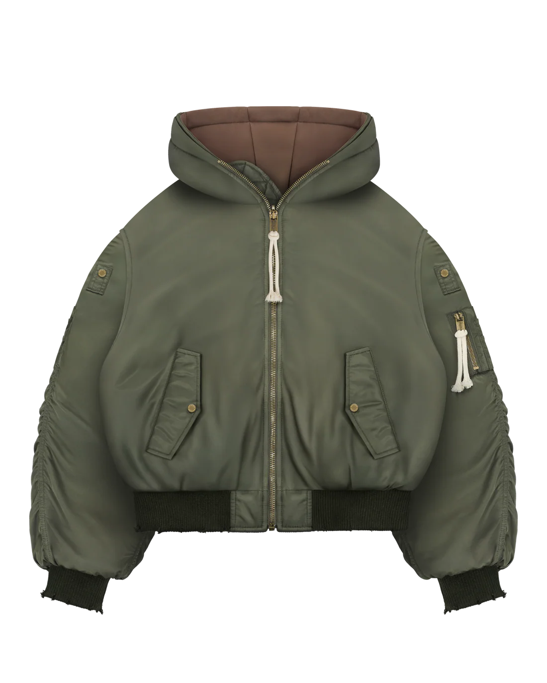 - Design: stile bomber, cappuccio foderato in pelliccia, polsini a coste, chiusura frontale con cerniera, tasche funzionali, oliva dall’esterno e marrone dall’interno