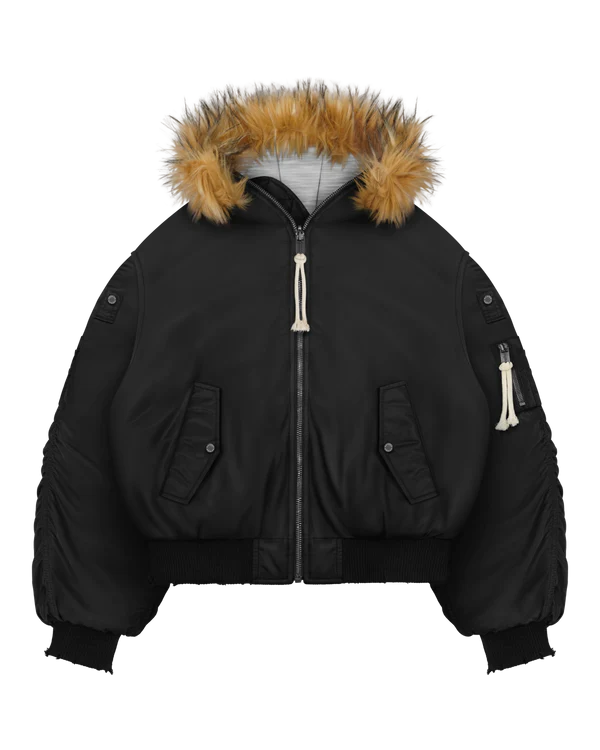 Design: Stile bomber, cappuccio foderato in pelliccia, polsini a coste, chiusura con zip