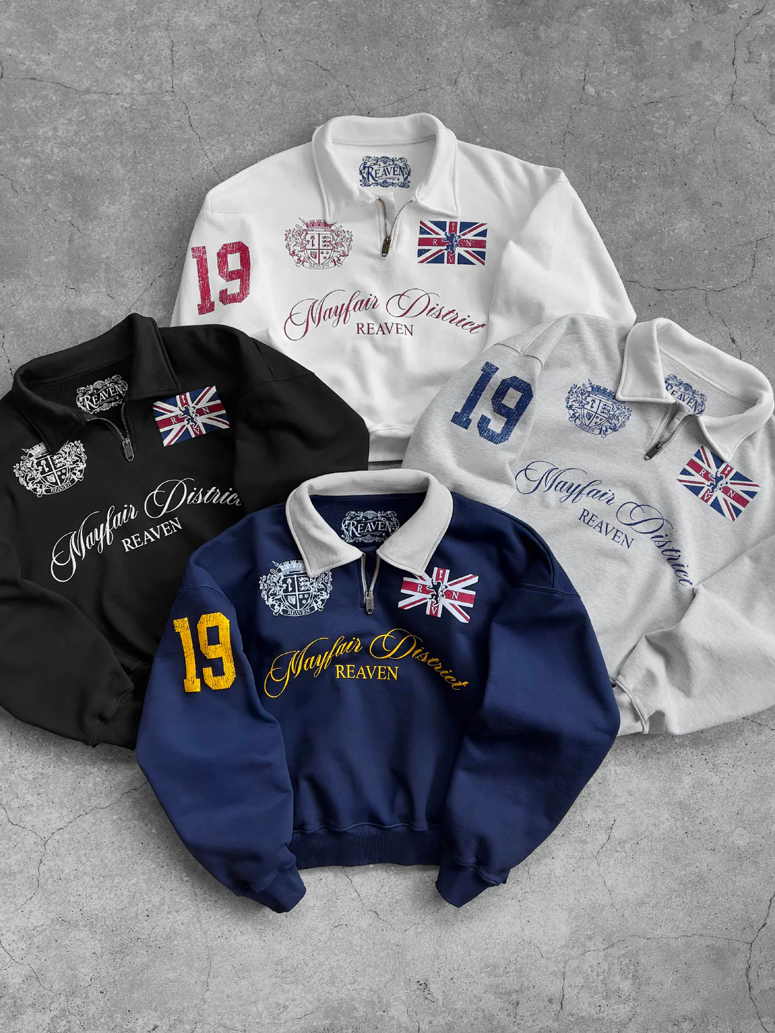 Logo: Presenta un ricamo bianco dettagliato dello stemma “Mayfair District Reaven” insieme alla classica bandiera Union Jack e al marchio numerico sulla manica.
