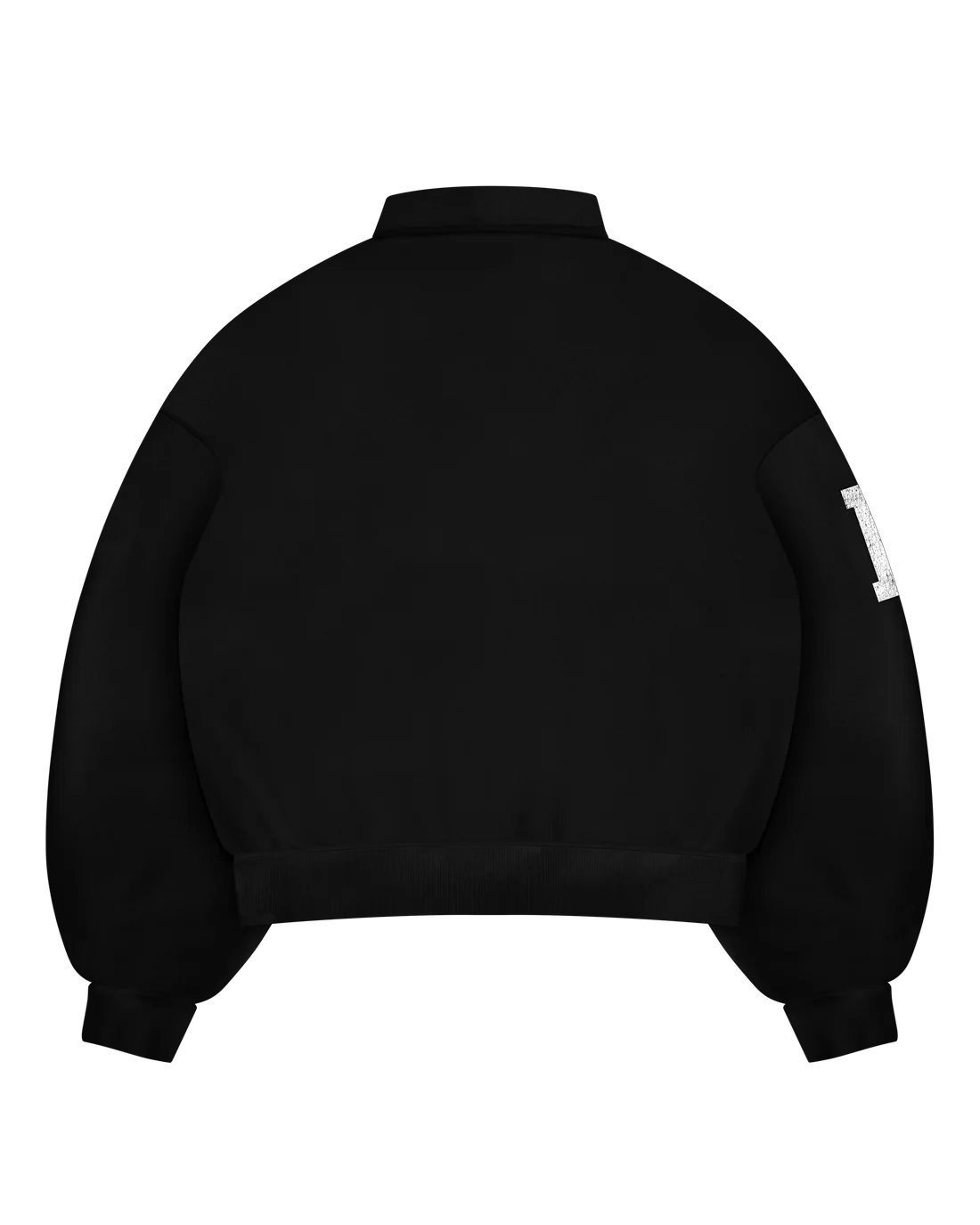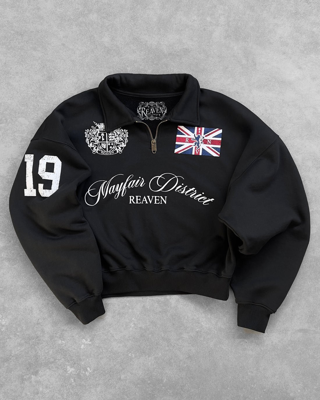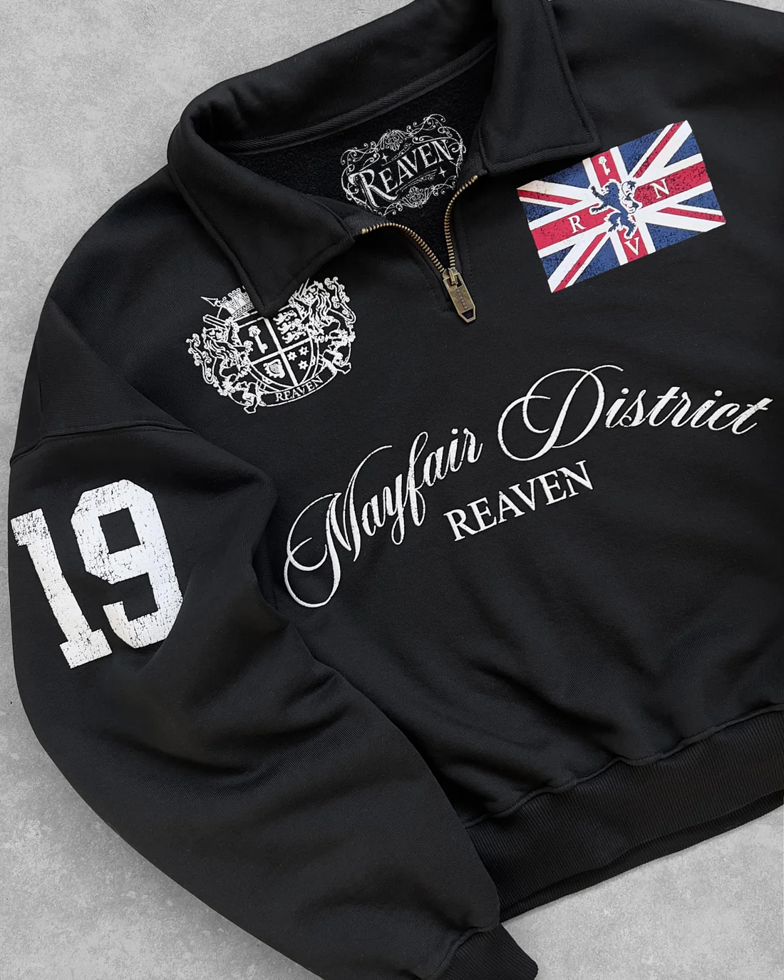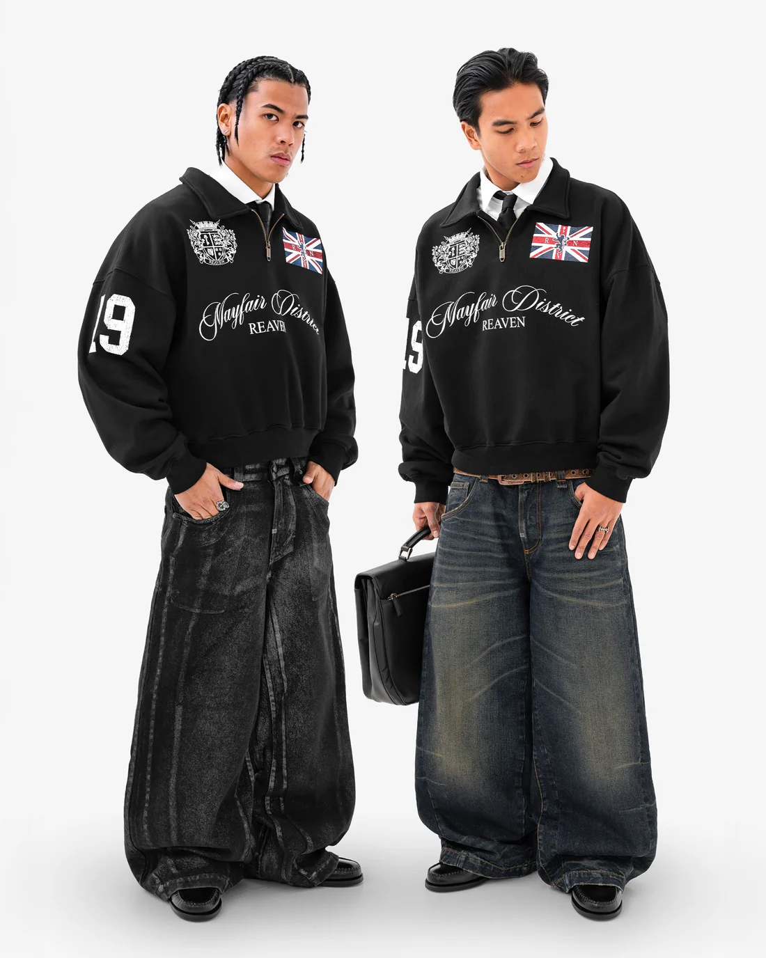 Definisci la tua estetica street con la polo Reaven Black Mayfair Half-Zip. Questo capo fonde la tradizione universitaria con lo streetwear moderno, presentando una silhouette corta e squadrata e spalle scese per un drappeggio rilassato. Il tessuto nero corvino funge da tela per intricati ricami ad alta densità, tra cui lo stemma del Mayfair District e un vivace motivo Union Jack. Rifinita con una cerniera personalizzata color oro e bordi a costine, questa polo conferisce un tocco sofisticato ma ribelle a qualsiasi guardaroba di alta moda.