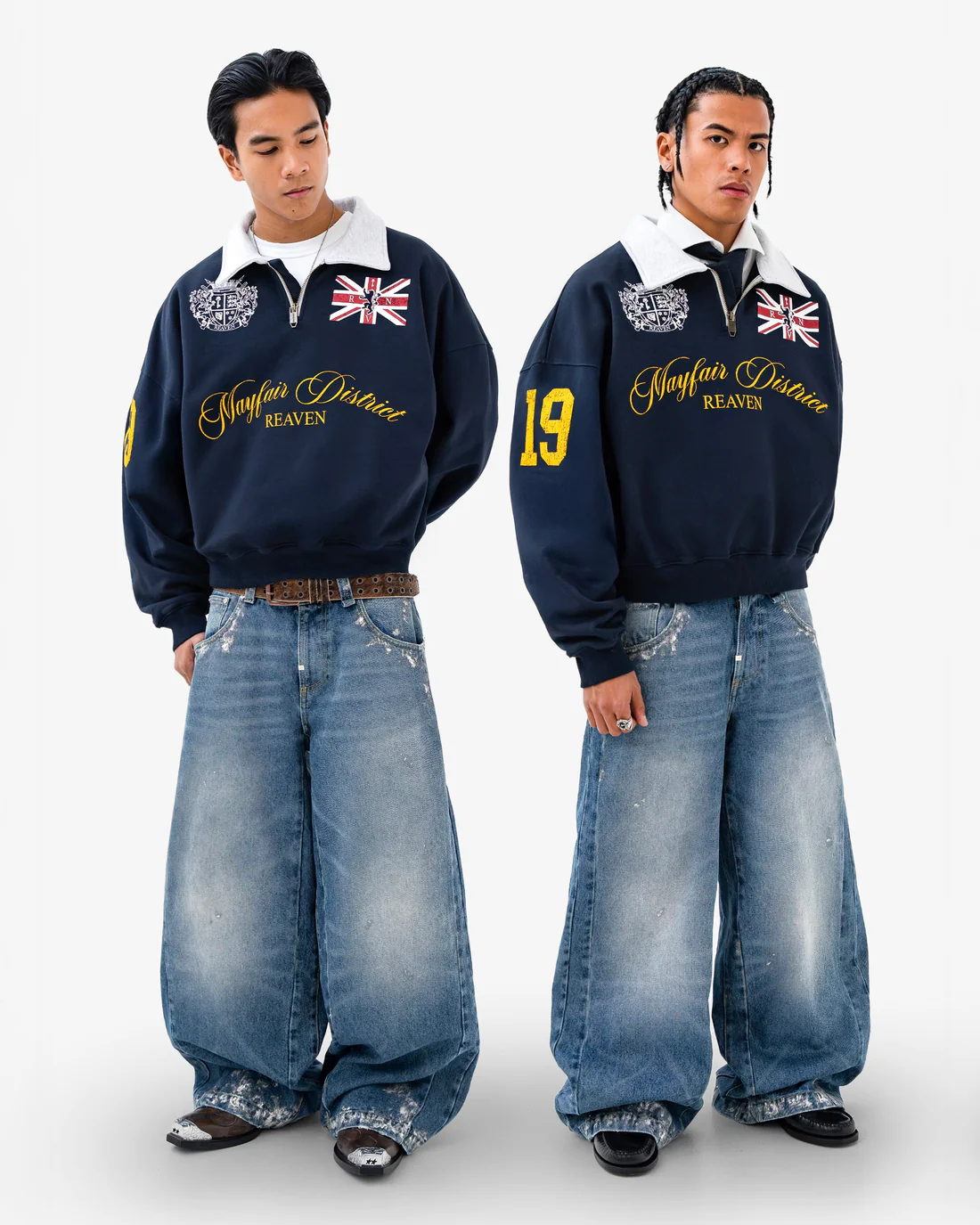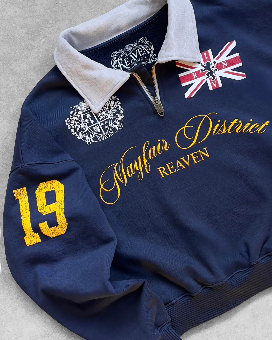 Entra in un mondo di prestigio universitario con la polo Reaven Navy Mayfair Half-Zip. Questo capo sorprendente presenta un corpo blu navy intenso in contrasto con un colletto bianco audace, che offre un’estetica classica da “vecchia scuola”. La parte anteriore presenta la scritta “Mayfair District” in oro, abbinata a uno stemma araldico dettagliato e a una tradizionale toppa Union Jack. Progettata con un taglio corto moderno e maniche ampie, questa polo coniuga la tradizione britannica vintage con una silhouette street contemporanea e di alta moda.